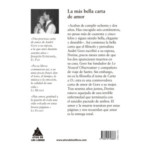 «Acabas de cumplir ochenta y dos años. Has encogido seis centímetros, no pesas más de cuarenta y cinco kilos y sigues siendo bella, elegante y deseable». Así comienza la bella carta que el filósofo y periodista André Gorz escribió a su esposa, Dorine, pocos meses antes de que los dos apareciesen muertos en su casa. Gorz fue fundador de Le Nouvel Observateur y compañero de viaje de Sartre. Sin embargo, no es la filosofía el tema de Carta a D.: esta es una conmovedora carta de amor de Gorz a su mujer. Tras sesenta años juntos, Dorine estuvo aquejada de una terrible enfermedad que terminaría con el suicidio pactado de ambos. El amor y la muerte transitan por estas páginas y nos recuerdan que amar es la entrega total.